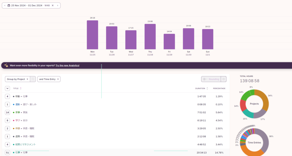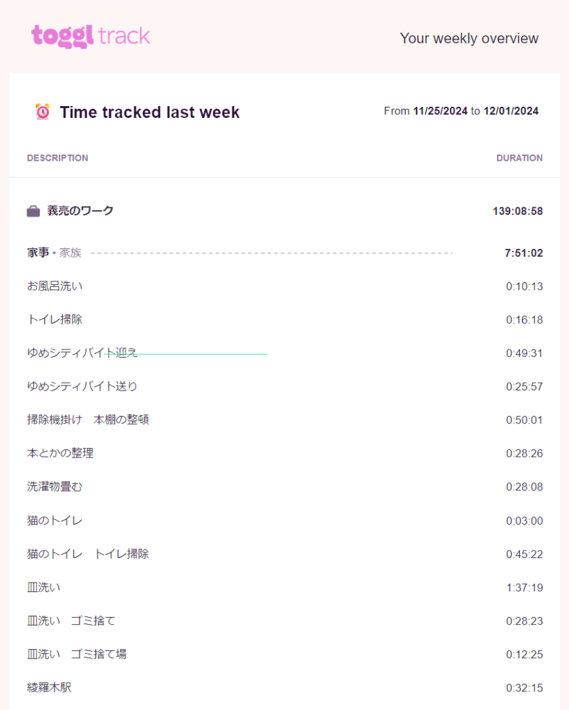 1週間毎にレポートにまとめてくれるので、時間をいい感じに使えたかどうか分かるし、こういうレポートをみると自己承認欲求が満たされるのです。