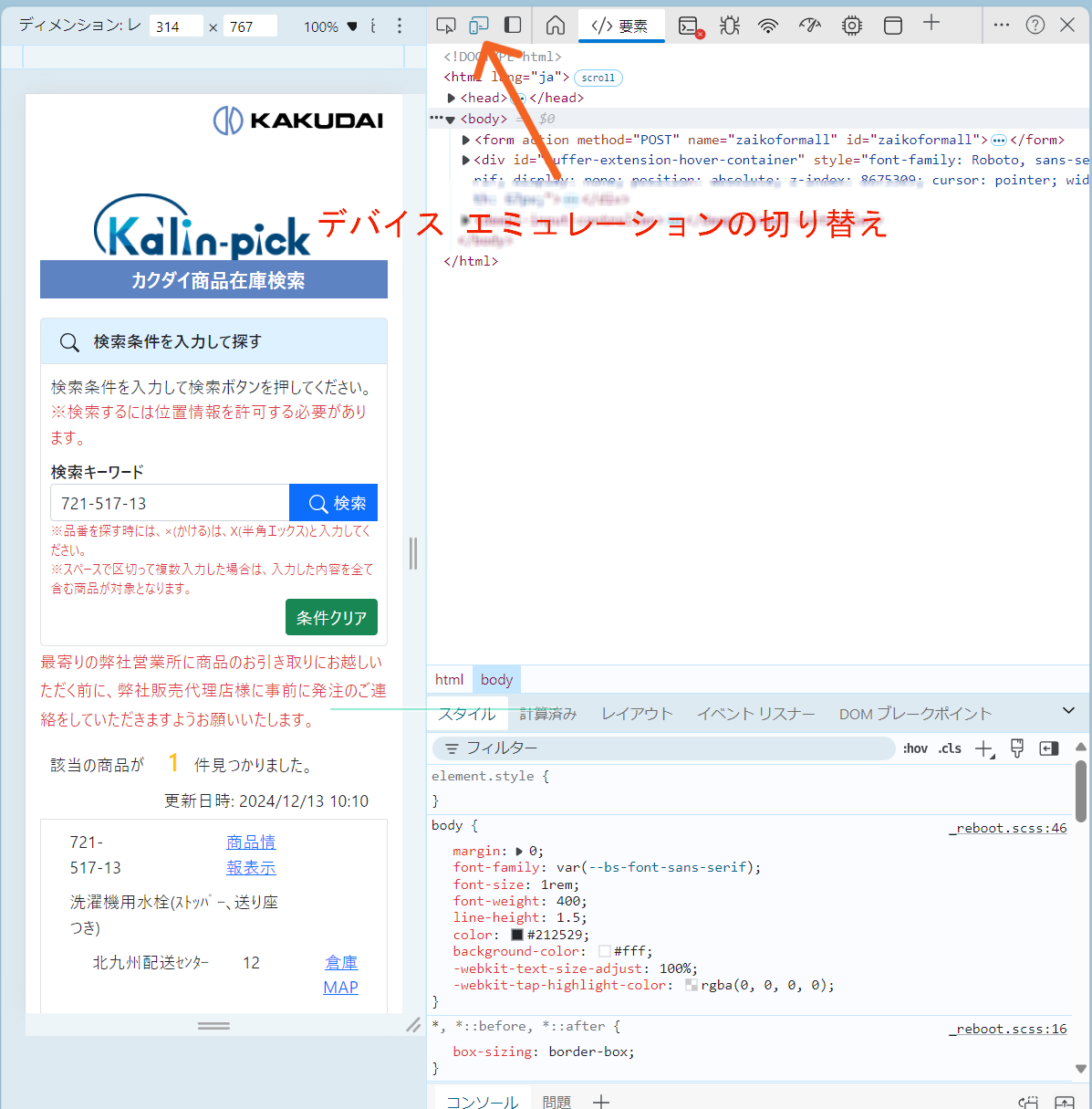 スマホモードになっていないときはこの「デバイス エミュレーションの切り替え」をクリックしましょう。